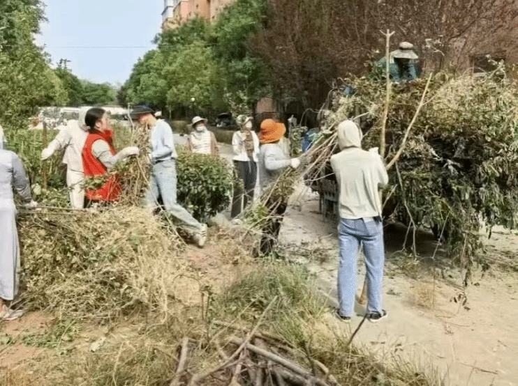 环境整治活动中,在包联领导的带动下,社区全员到场,不惧高温酷暑,不畏辛苦劳动,聚集在小区单元前高大树木和道路两侧绿化带,以及遮挡路灯、电线、居民窗户的高大乔木和存在病虫害的枯枝,组织专业人员5-8人,前后历时近10天,进行砍伐、修剪、平整和除杂工作。和邻居们一起劳动时,陌生的面孔渐渐变得亲切。有人拿来自家的清洁工具,有人主动清理最难打扫的角落,大家笑着说“这点活儿不算啥”。看着焕然一新的楼道和花园,心里满是踏实。原来,改变环境的不只是扫帚和抹布,更是每个人多走一步的自觉。这份实践让我明白,美好社区,需要我们从“旁观者”变成“行动者”。