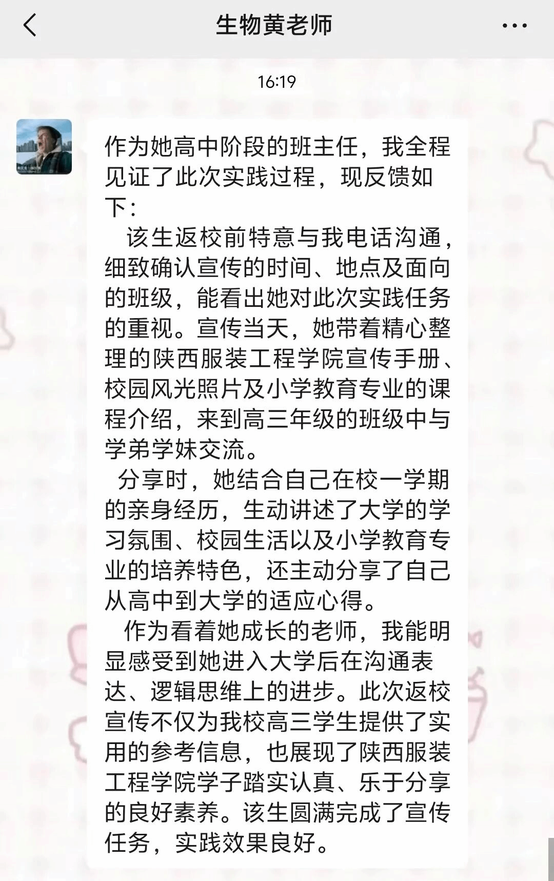 这个寒假,我回到了我的高中母校,从一名聆听宣讲的高三学子,转变为站上讲台、讲述故事的宣讲人,我向学弟学妹们分享了我的学习经验、大学生活,也系统介绍了陕西服装工程学院的办学特色、专业优势、校园文化与就业前景,努力把最真实、最鲜活的“陕服故事”讲给大家听。未来,我会继续带着在陕服收获的知识与力量,努力提升自我,用实际行动讲好陕服故事,传播母校声音,也希望更多优秀的陇县学子能够走进陕西服装工程学院,在更广阔的平台上追逐梦想、绽放光彩。