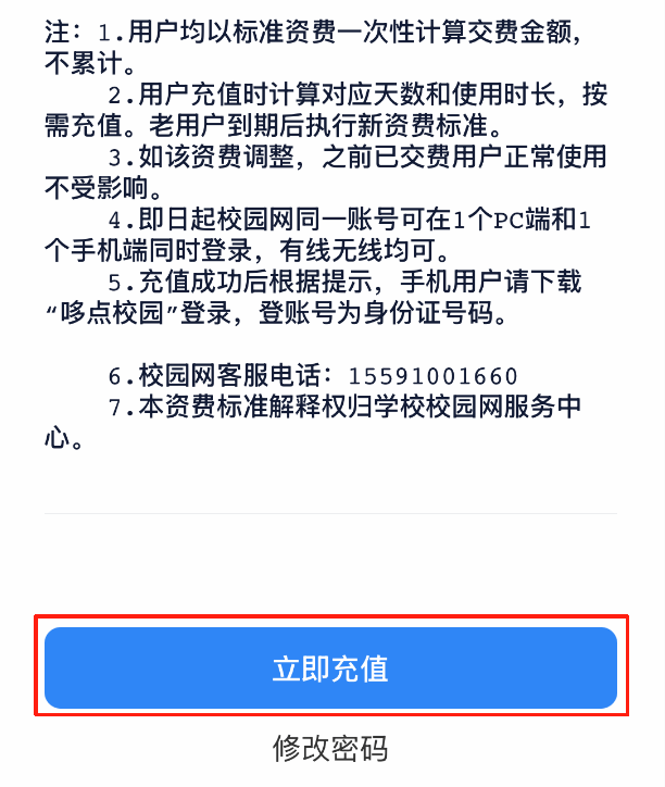 进入资费说明界面后,点击“立即充值”,选择对应天数,通过微信支付即可充值成功。
