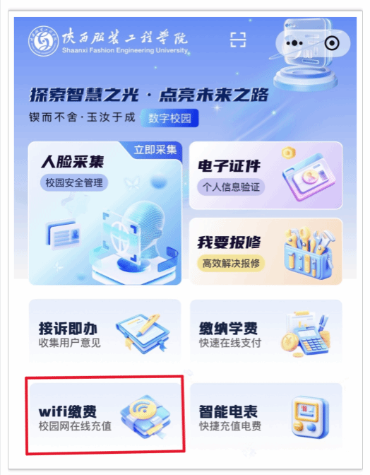 打开“陕服学工”小程序,点击“wifi缴费”模块。