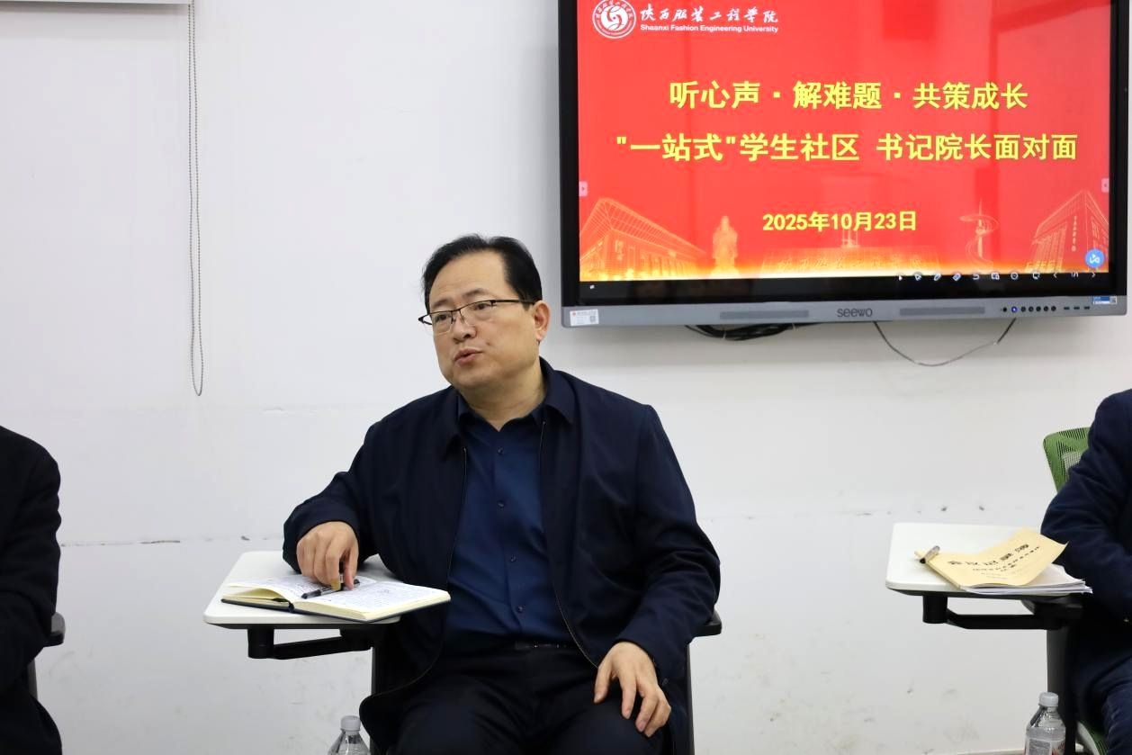 陕服新闻网讯(董良超)10月23日下午,我校“一站式”学生社区服务中心气氛热烈、交流融洽,首期“听心声·解难题·共策成长”书记院长面对面活动在此顺利举行。校党委书记王岗、党委副书记刘继兵出席,学校党政办、党委工作部、学生工作部、教务处、校团委等部门负责人以及学院党委书记代表、辅导员代表参加,与来自不同专业的30余名学生代表围坐交流,精准对接学生成长需求,共商学校发展大计。座谈会由学工部副部长董良超主持。