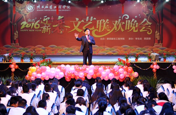 1月5日晚,我校图书馆四楼会议厅灯火辉煌、欢声笑语。我校大型2016迎新春联欢晚会在这里举行。镐京集团董事局主席、陕西服装工程学院董事长吕明、学院院长王鹏飞、党委书记张进平、副院长吕超、温小郑、赵怀礼、副书记刘明夫、院长助理陈登文等出席;执行院长李立向大会宣读了《陕西服装工程学院关于表彰2015年暑期社会实践中参与招生工作优秀学生的决定》。