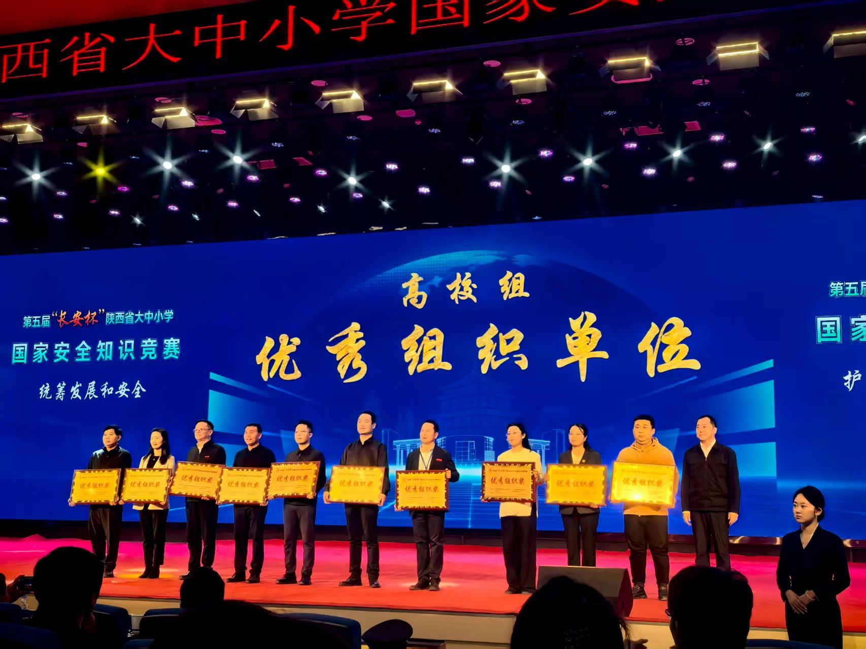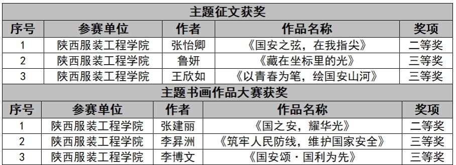 陕服新闻网讯(学生处)近日,由陕西省委国家安全委员会办公室、省委教育工委、省教育厅和省国家安全厅主办的第五届“长安杯”陕西省大中小学国家安全知识竞赛(高校组)决赛举行。我校荣获“优秀组织单位”称号,郝谊、陈昱杭、孙艺菲、余金杉等4名同学代表学校参赛。在主题征文中,获二等奖1项、三等奖2项;书画作品获二等奖1项、三等奖2项。