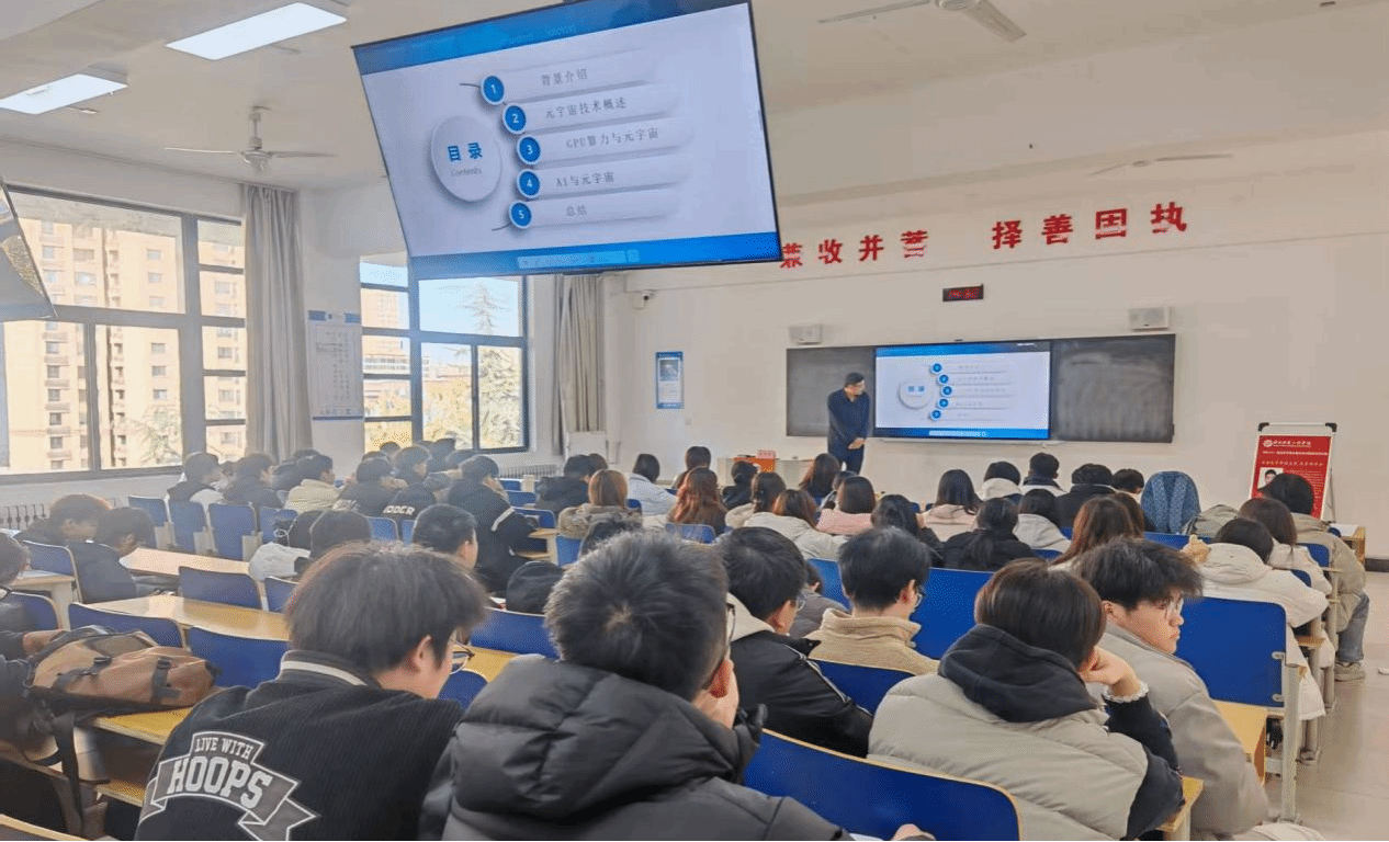 为拓宽学生学术视野,把握数字时代的前沿科技动态,2025年11月18日下午,西安电子科技大学博士生导师朱虎明博士在信息工程学院为师生,开展了一场题为“GPU×AI:驱动元宇宙从概念走向现实的双引擎”的专题讲座。